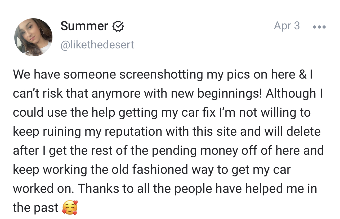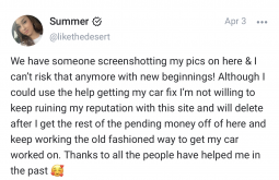 Just gotta keep posting pics of my pussy til my car is paid off. Then I’ll use to sucker someone else into paying my bills.